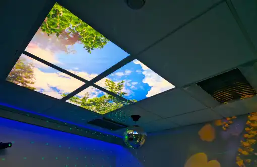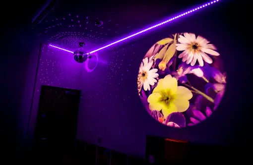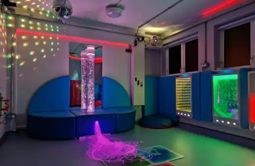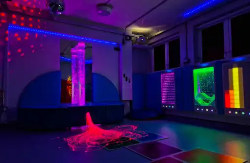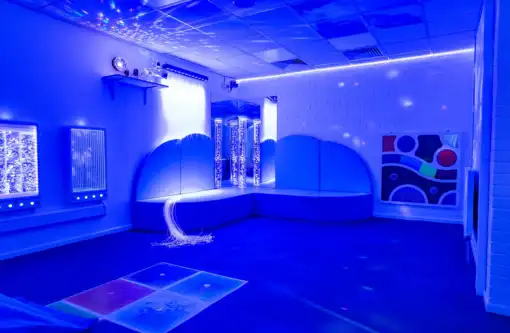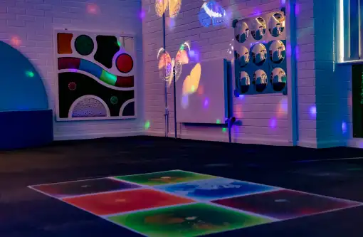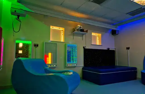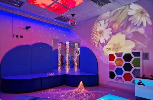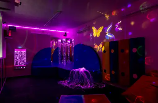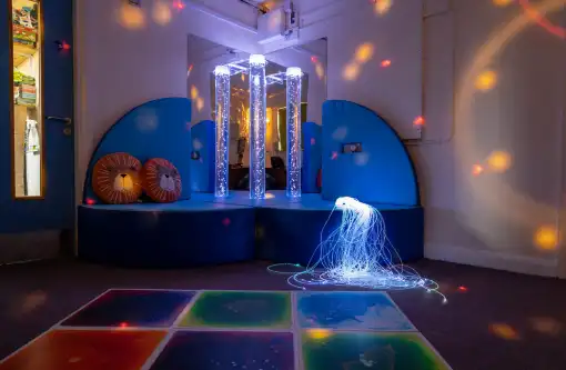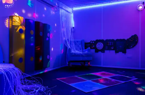 A sensory room is a calming, immersive space that intentionally combines a variety of stimuli such as sound, colour, light, and tactility.